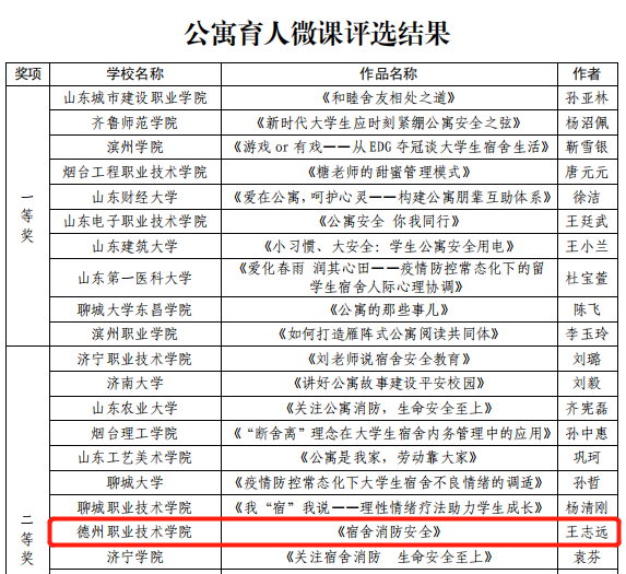 近日,山东省教育厅公布了2021年高校“公寓的故事”主题系列活动评选结果,我系推送的育人微课《宿舍消防安全》荣获二等奖。