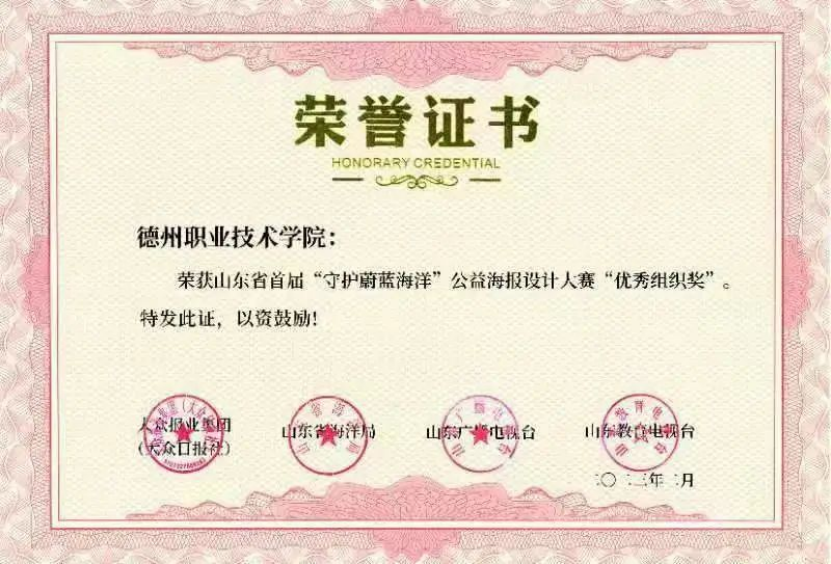 大赛一经公布,我系学生积极踊跃的参加,此次大赛使我系学生加强了对海洋环境保护的意识。大赛中我校荣获山东省首届“守护蔚蓝海洋”公益海报设计大赛“优秀组织奖”,我系学生杨佳琪荣获“守护蔚蓝海洋”公益海报设计大赛三等奖。