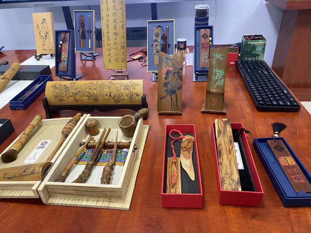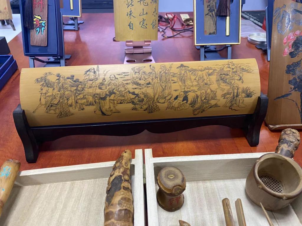 在唐万武先生的介绍下,老师们逐渐理解了木刻刀笔书画的含义——以木为纸,以刀代笔,历经选材、描绘、翻版、镌刻、填色、护面等工序,将中国书画镌刻于竹木之上,而神韵不减。
