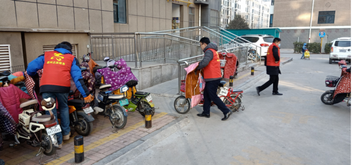 团队成员不畏严寒,分组协作,开展清扫环境卫生,排放自行车、电动车,发放禁止燃放烟花爆竹的知识宣传册。