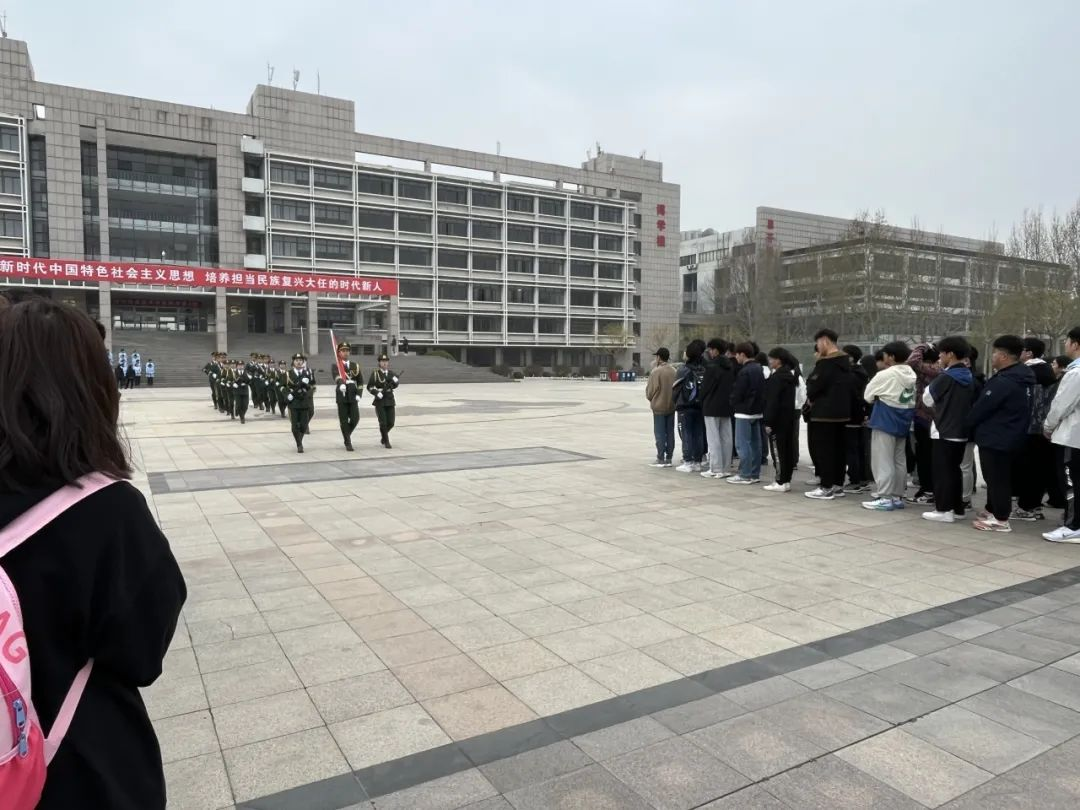 伴随着激昂的《义勇军进行曲》,鲜艳的五星红旗缓缓升起,随风飘扬,全体学生向国旗行注目礼,齐声高唱国歌,向国旗致以崇高的敬意。