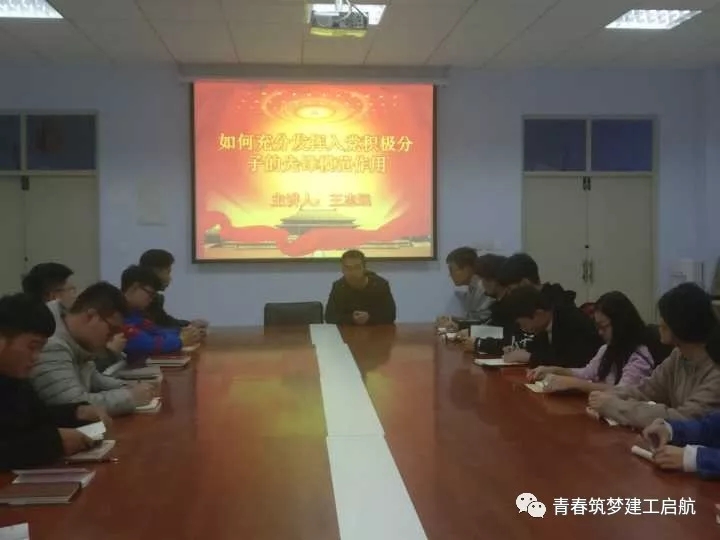 11月6日下午,我系第32期入党积极分子培训第五课“入党积极分子在学生工作中如何起模范带头作用”在我系建筑应用中心会议室举行,本次培训由建筑系第二支部党员王志远讲授。