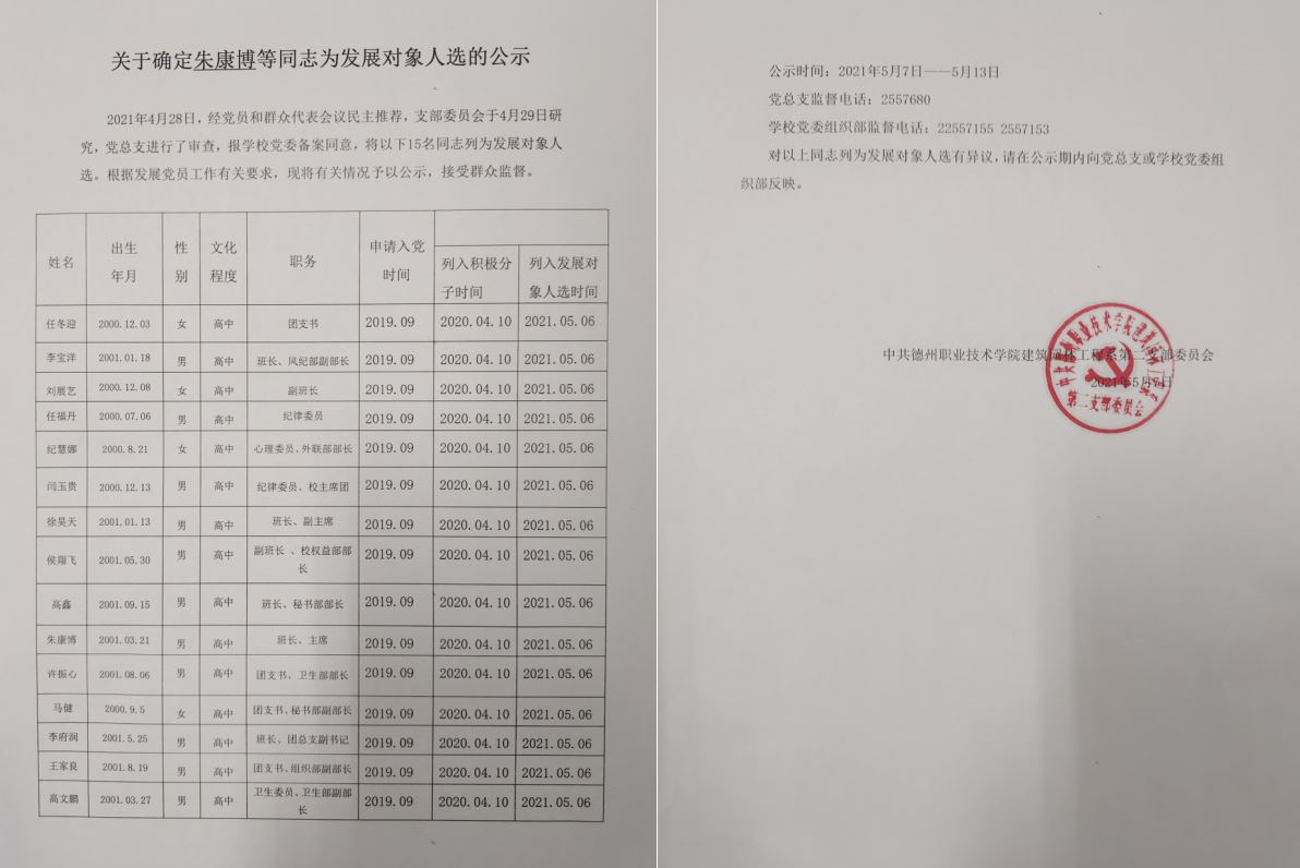 2021年4月28日,经党员和群众代表会议民主推荐,支部委员会于4月29日研究,党总支进行了审查,报学校党委备案同意,将以下15名同志列为发展对象人选。根据发展党员工作有关要求,现将有关情况予以公示,接受群众监督。