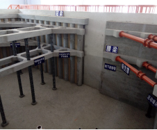 深基坑实训室建成于2016年,是目前华北地区唯一的室内基础展示场,是建筑工程技术专业施工技术系列教学实训室之一,主要用于基坑支护施工、岩土勘察、基坑验槽等的教学。实训室根据地区常见的工艺形式,缩尺修建了多组基坑支护教学模型,模拟放坡开挖与支护、重力式格挡墙与SMW工法、拉森板桩桩锚、内支撑、地下连续墙等支护形式。结合模型展示与动态仿真模拟及图片案例介绍,多方位多视角展示相关工艺,让学生快速掌握流程与做法。同时设置了施工安全系列教学模型模拟施工现场,使学生不出校园就可以感受现场氛围,树立质量安全意识。