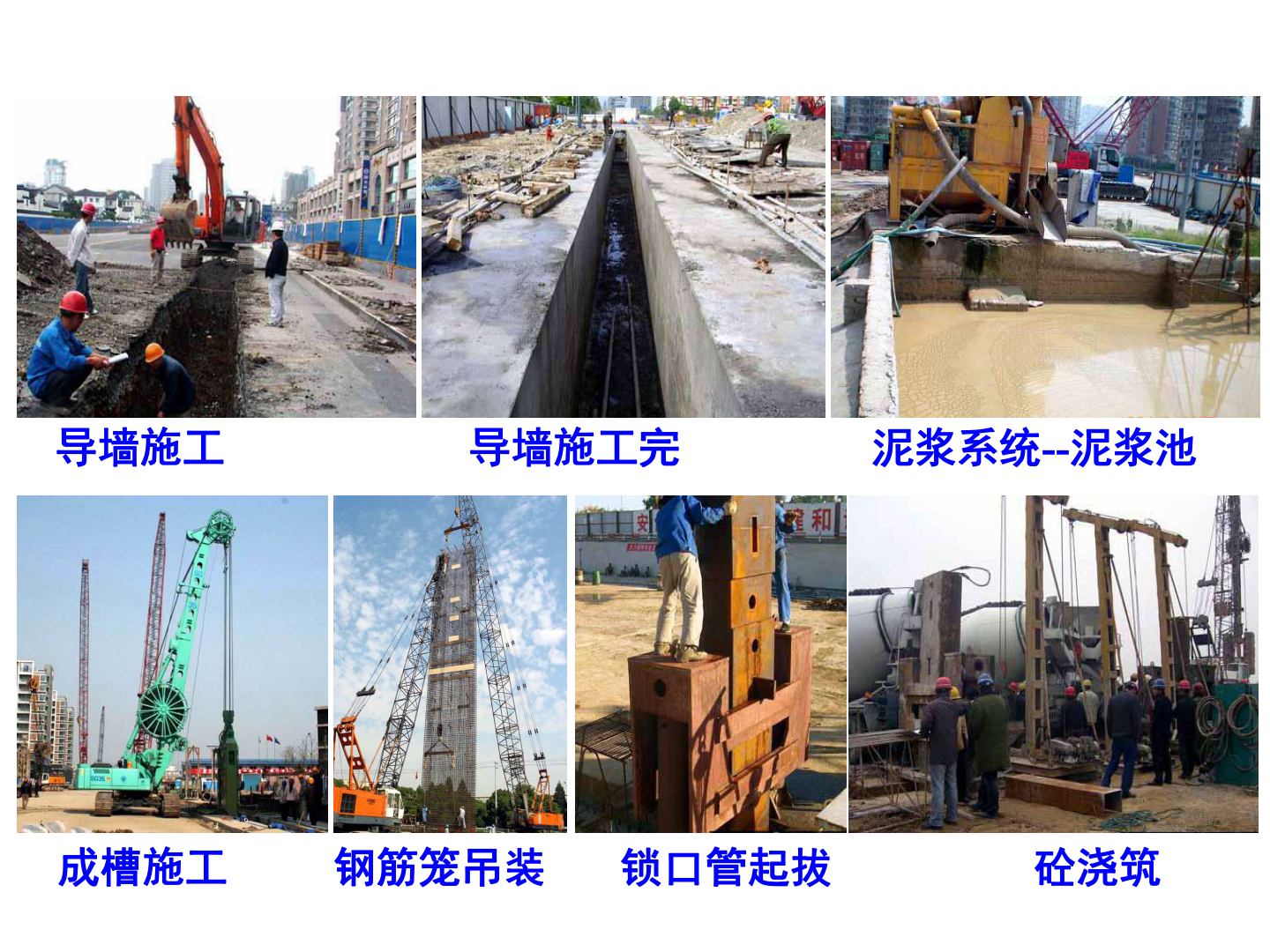 1.概念:用特制的挖槽机械在泥浆护壁的情况下,每次开挖一个单元槽段后,吊放钢筋笼与浇筑混凝土,各槽段用特制的接头连接形成的连续的地下墙体。